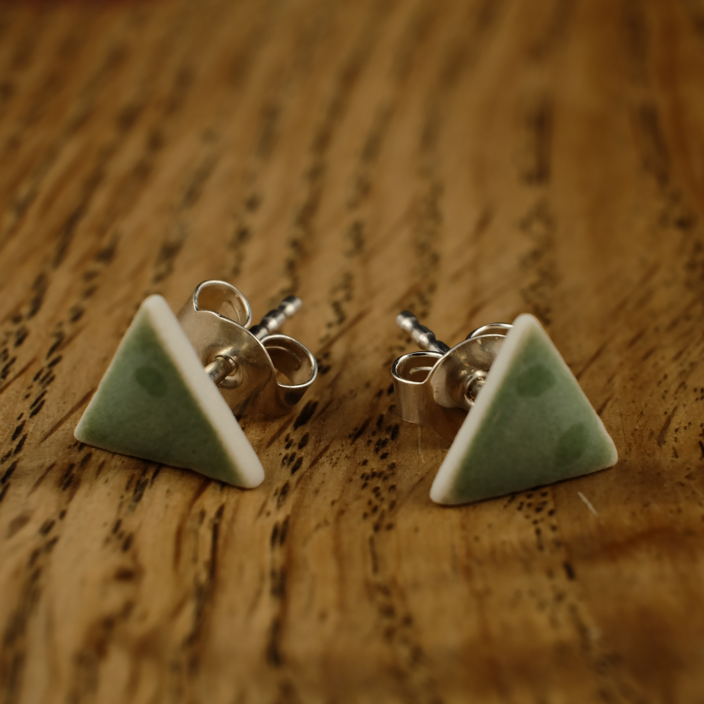Porzellan Ohrstecker in Dreiecksform mit Verschlussteil und Ohrstecker aus 925 Silber. Ein schönes handgefertigtes Einzelstück aus unserer Manufaktur. Der Ohrstecker ist mit einer grünen Glasur versehen.