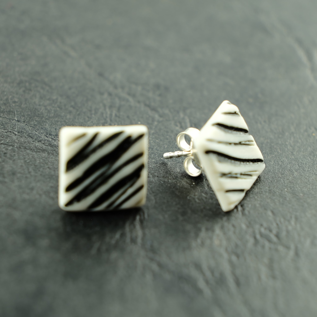 Porzellan Ohrstecker in Schwarz/Weiß mit Verschlussteil und Ohrstecker aus 925 Silber. Ein schönes handgefertigtes Einzelstück aus unserer Manufaktur. Der Ohrstecker ist mit einer schwarzweißen Glasur versehen.