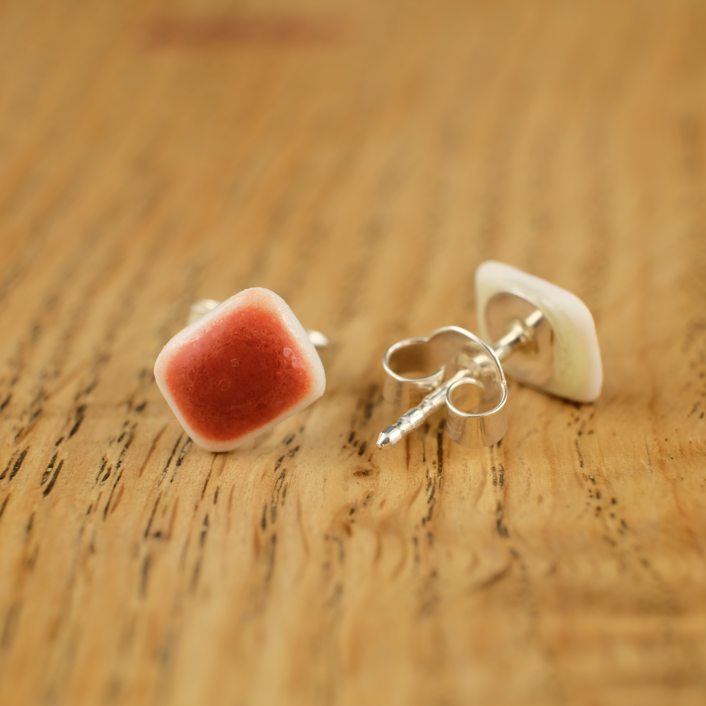 Porzellan Ohrstecker in Rauteform mit Verschlussteil und Ohrstecker aus 925 Silber. Ein schönes handgefertigtes Einzelstück aus unserer Manufaktur. Der Ohrstecker ist mit einer orangen Glasur versehen.
